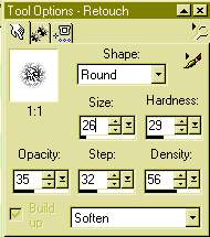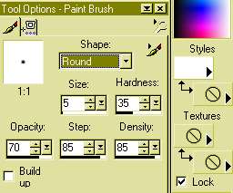 12. Add a new layer and name it "Nose". Go to Selections, load from Disk, open bjh_hfnose.sel, Flood fill with Black. DO NOT DESELECT. Add a new layer and name it "Nose highlight". Select the paintbrush tool and use the settings as shown below: